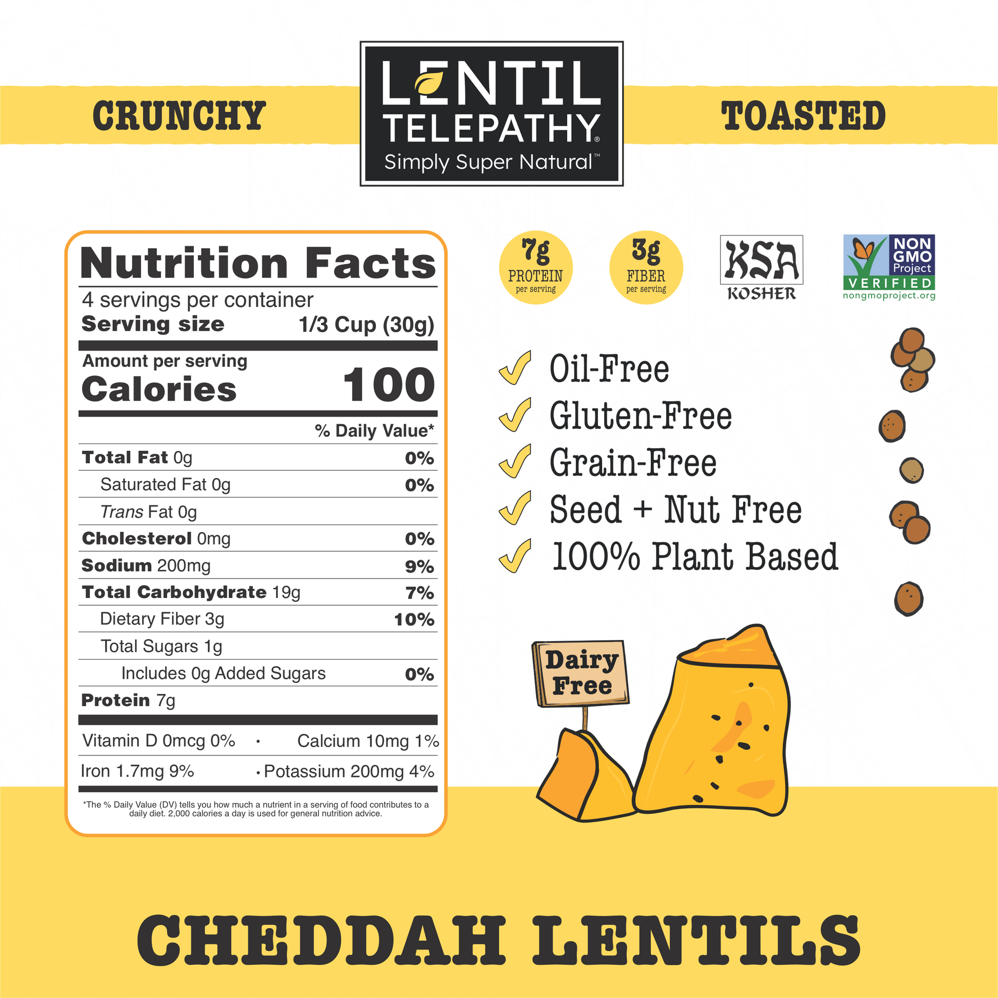 Lentil Telepathy Savory Cheddah (Dairy Free) Crunchy Toasted Snacks 3 Pack